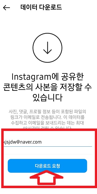 7. 사진, 댓글, 프로필 정보 등이 포함된 파일을 다운로드 받을 수 있는 링크를 48시간 이내에 이메일로 전송해줍니다.